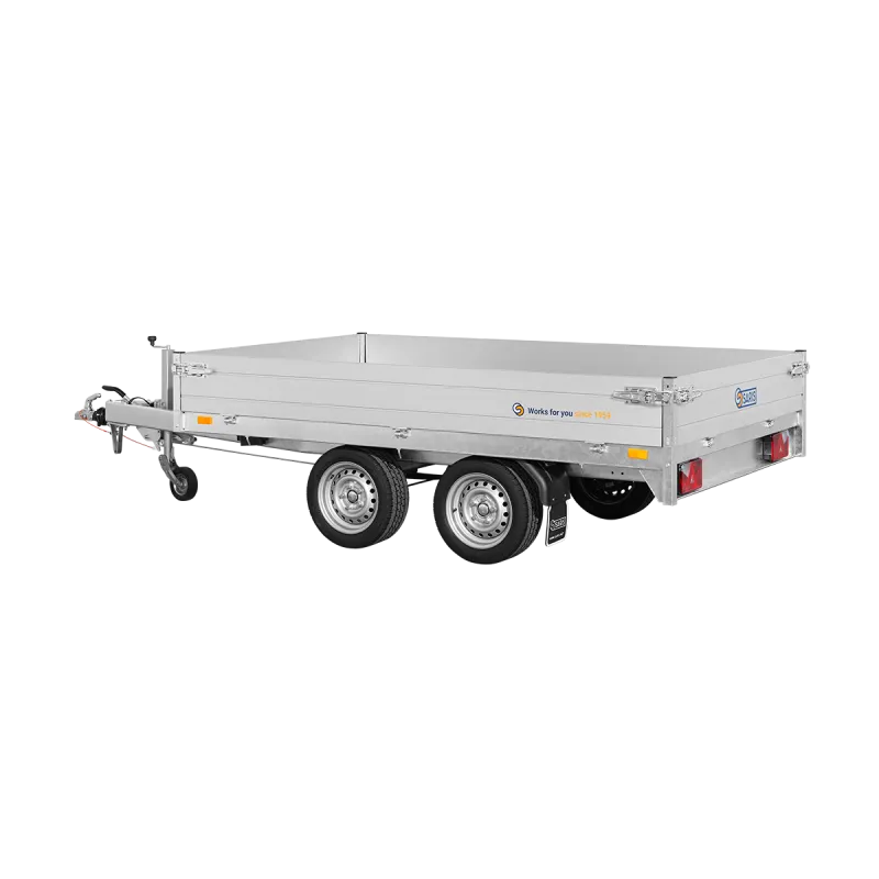 Le plateau est équipé de ridelles en aluminium double paroi d’une hauteur de 30 cm avec fermetures extérieures pour un maintien fiable du chargement. Le seuil de chargement surbaissé facilite le chargement de machines, matériels et matériaux. La roue jockey escamotable surdimensionnée permet des manœuvres simples et précises. Les crochets d’arrimage antibruit et les ergots de sanglage garantissent une fixation sécurisée pendant le transport. La remorque est livrée avec le livret d’utilisation et d’entretien constructeur.