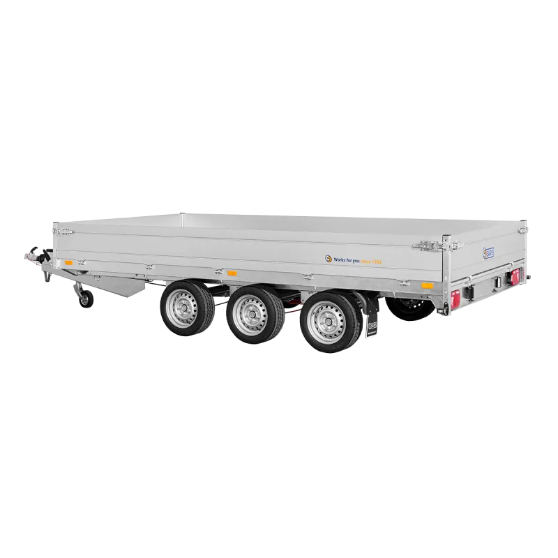 Remorque plateau multi usage Saris modèle PL40620435003 conçue pour un usage professionnel intensif avec capacité maximale châssis entièrement soudé très haute rigidité et configuration trois essieux pour une stabilité optimale